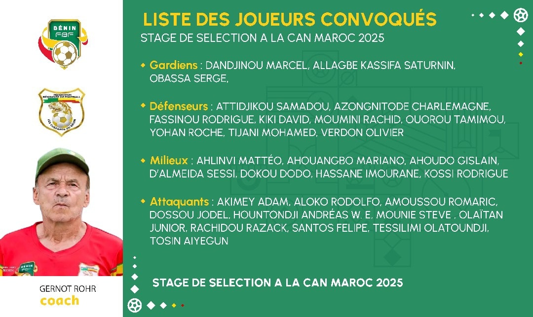 Le sélectionneur des Guépards du Bénin, Gernot Rohr, a dévoilé une liste de 30 joueurs en vue du stage de préparation à la CAN Maroc 2025 prévue du 21 décembre 2025 au 18 janvier 2026. A l’issue du stage, la liste définitive des joueurs retenus sera publié. Voici les joueurs présélectionnés...