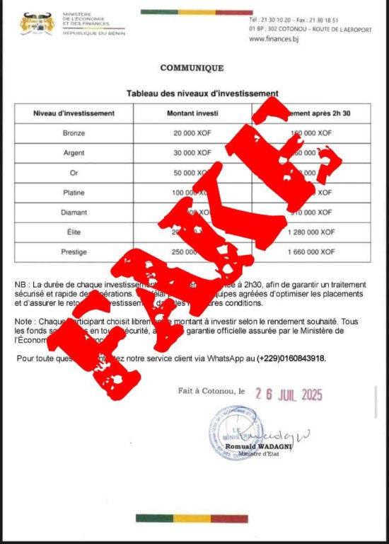Une fausse signature et un tampon falsifié du ministre d’État Romuald Wadagni sont apposés sur le document. Il propose même un contact WhatsApp pour “service client”.