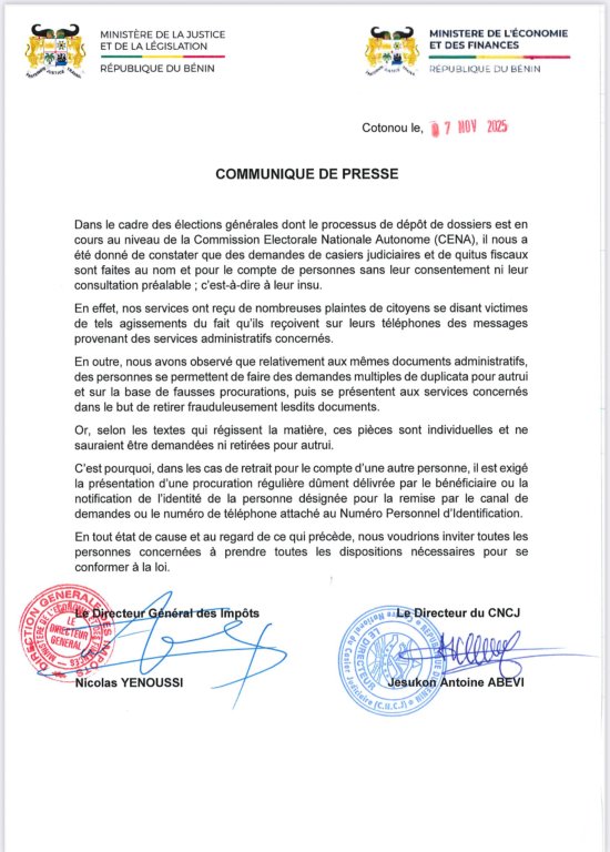 Le ministère de la Justice et de la Législation et le ministère des Finances et de l’Economie dénoncent des demandes frauduleuses de casiers judiciaires et de quitus fiscaux effectuées dans le cadre du processus de dépôt des dossiers pour les élections communales et législatives. C’est ce qui ressort de la déclaration conjointe faite par les représentants des deux ministères ce vendredi 7 novembre 2025.