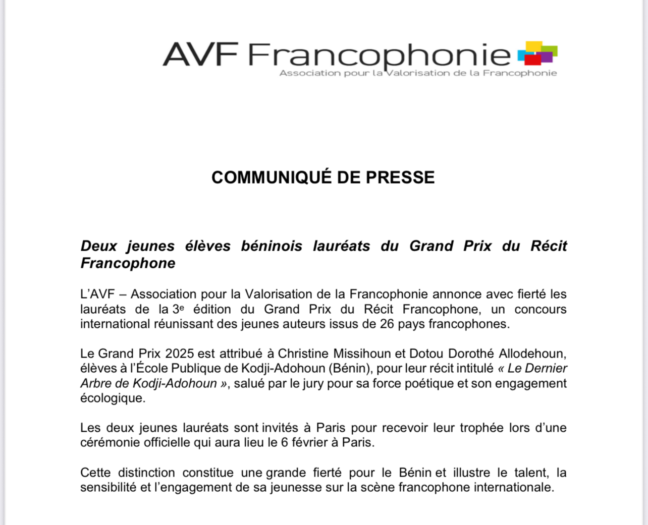 Cette distinction constitue une grande fierté pour le Bénin et illustre le talent, la sensibilité et l’engagement de sa jeunesse sur la scène francophone internationale.
