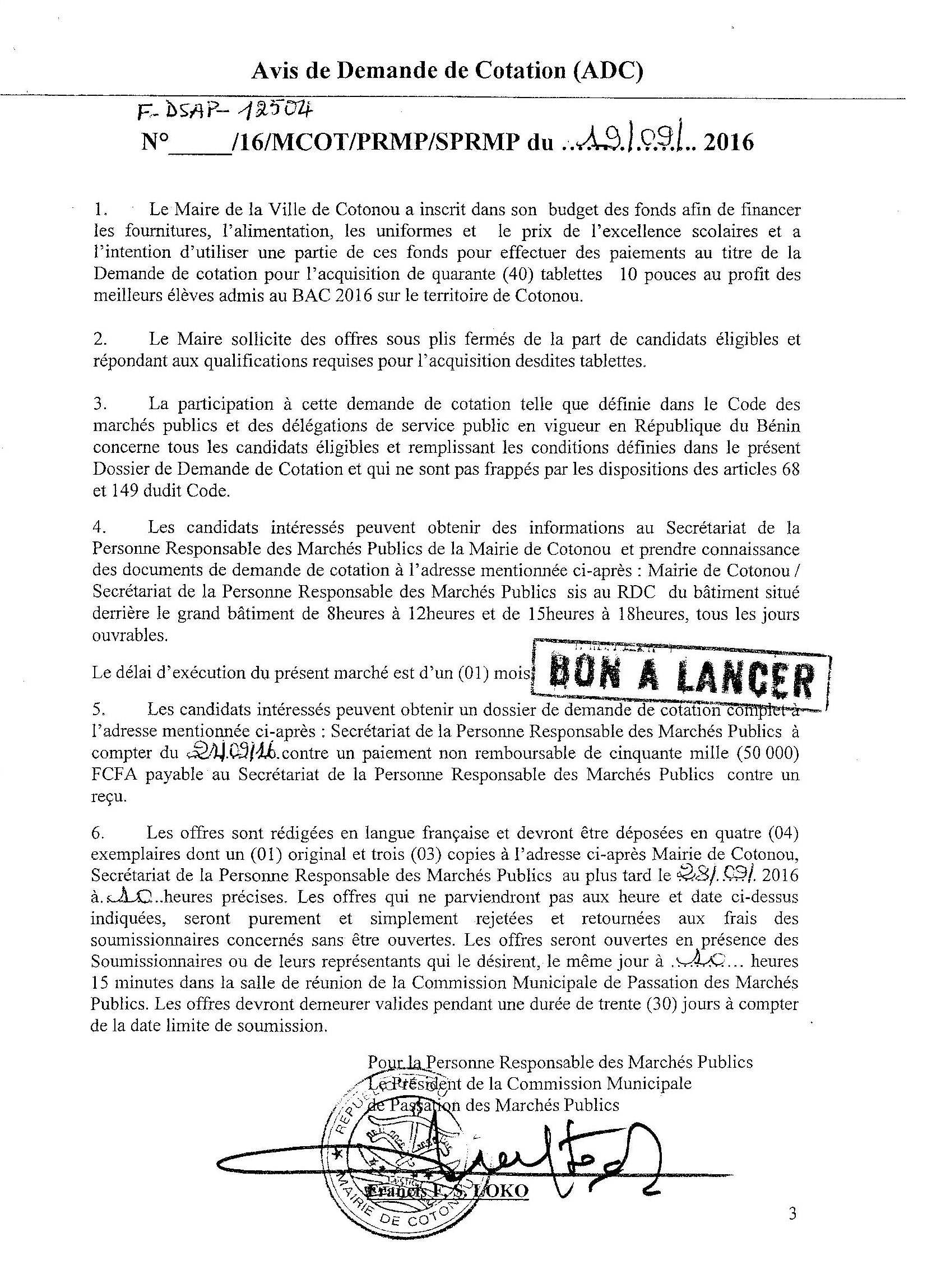 Important avis d’appel d’offre de la Mairie de Cotonou
