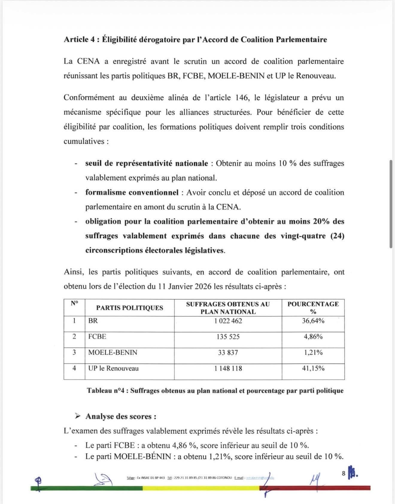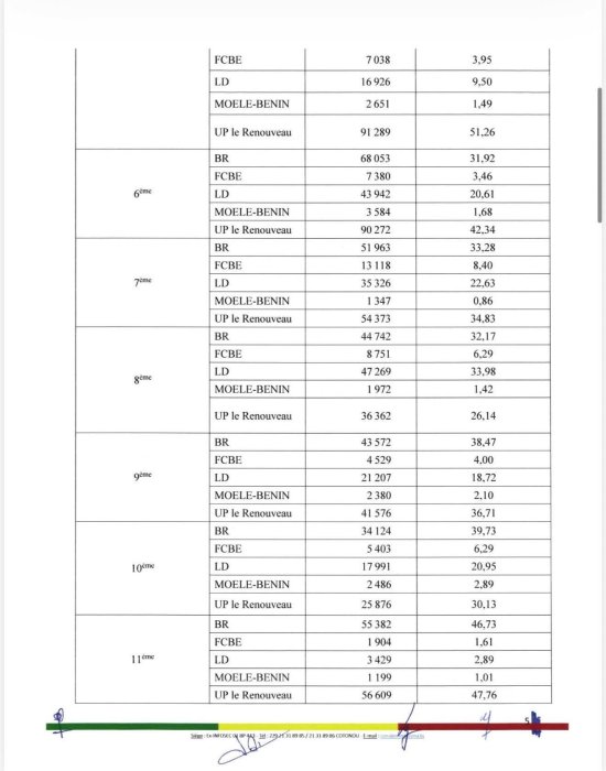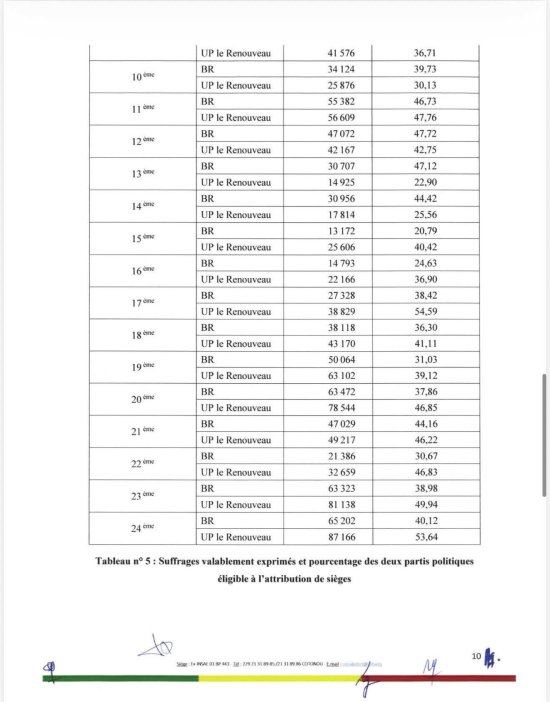 Les partis de la mouvance présidentielle BR et UP-R sont les seuls partis ayant franchi le seuil légal de 20% des suffrages dans chacune des circonscriptions électorales. Voici l’intégralité de la décision de la CENA.