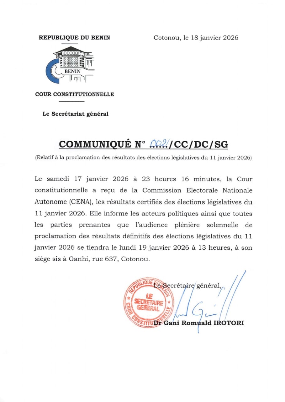La Cour Constitutionnelle va proclamer ce lundi 19 janvier 2026, les résultats définitifs des élections législatives. L’audience plénière aura lieu à son siège sis à Ganhi à 13 heures.