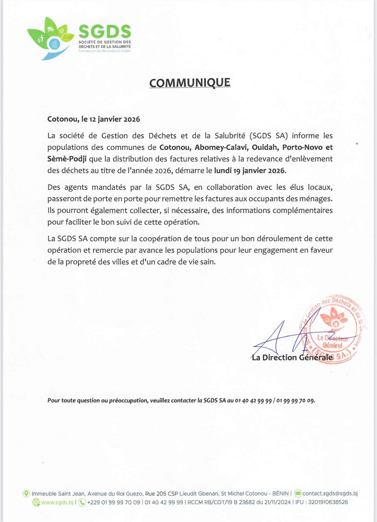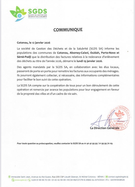 populations des communes de Cotonou, Abomey-Calavi, Ouidah, Porto-Novo et Sèmè-Podji que la distribution des factures relatives à la redevance d’enlèvement des déchets au titre de l’année 2026, démarre le lundi 19 janvier 2026.