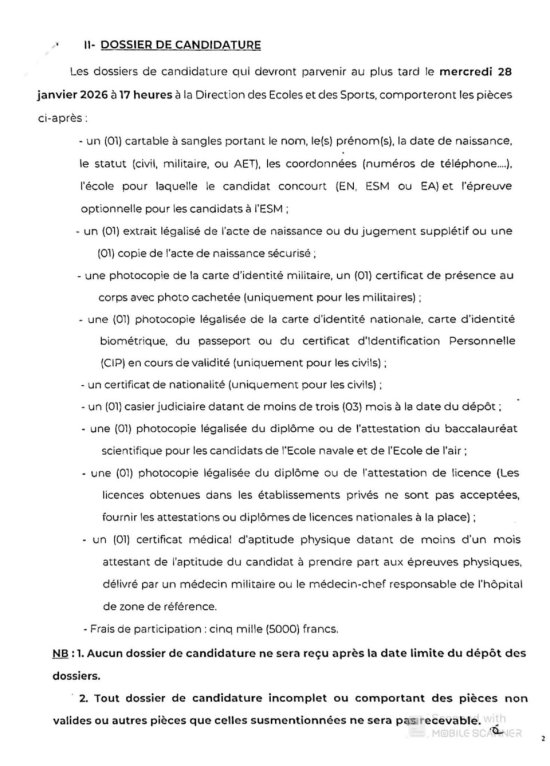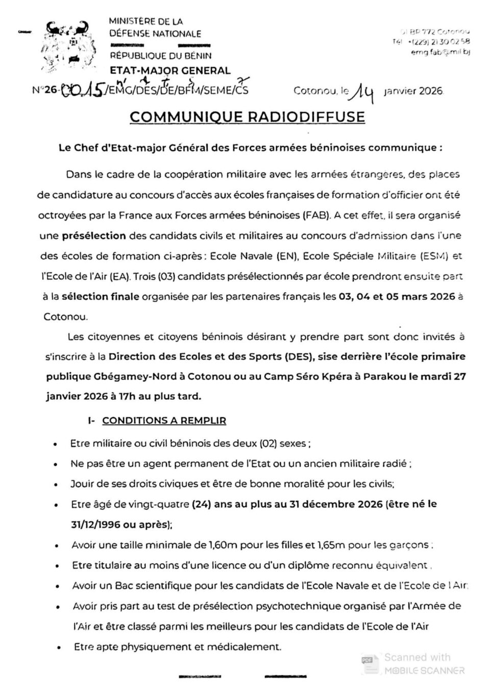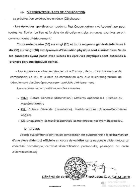 Dans le cadre de la coopération militaire avec la France, l’Armée béninoise organise un test de présélection de candidats civils et militaires pour le concours d’admission à l’Ecole Navale (EN), Ecole Spéciale Militaire (ESM), et l’Ecole de l’Air (EA). L’annonce a été faite à travers un communiqué radiodiffusé.