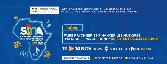 Le Sofitel Cotonou Marina Hôtel accueille du 13 au 14 novembre 2025, le Salon des Industries Musicales d’Afrique Francophone (SIMA 2025). Ce grand rendez-vous est organisé avec le soutien du ministère du Tourisme, de la Culture et des Arts à travers l’Agence Bénin Tourisme et plusieurs autres partenaires.