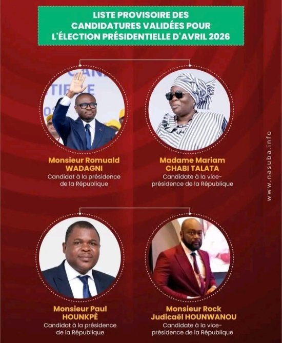 Par Décision EP25- 012 du 13 novembre 2025, la Cour constitutionnelle a validé les dossiers de candidature des duos Romuald Wadagni-Mariam Chabi Talata de la majorité présidentielle, et Paul Hounkpè-Judicaël R. Hounwanou de l’opposition, pour l’élection présidentielle d’avril 2026. Voici la Décision de la Cour.