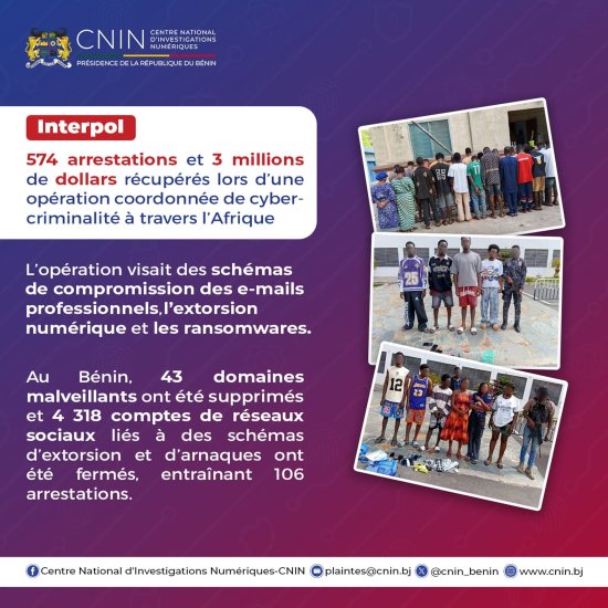 En un mois, 106 cybercriminels ont été arrêtés au Bénin et 4318 comptes ont été fermés. C’est dans le cadre de l’opération Sentinelle, menée conjointement avec Interpol. La lutte contre la cybercriminalité s’intensifie à l’échelle continentale. Une opération cordonnée dans 19 pays a permis d’arrêter 574 cybercriminels et de récupérer 3 millions de dollars. Selon le Centre national d’investigation numériques, l’opération a ciblé des schémas de compromission des e-mails professionnels et (…)