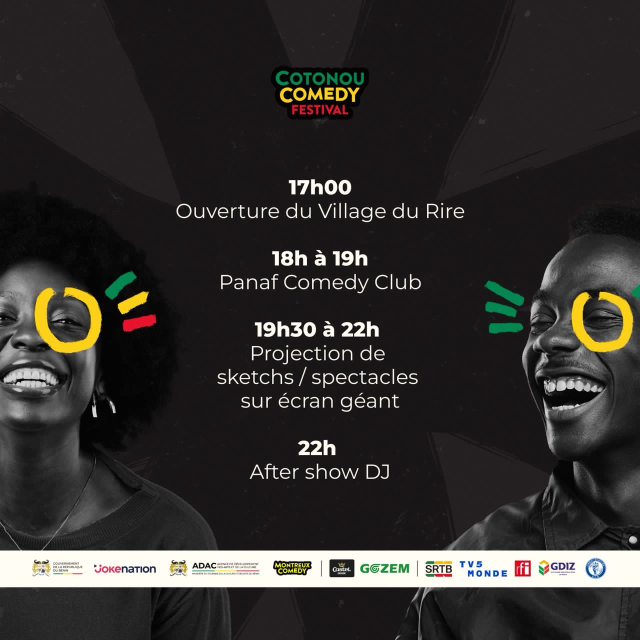 Chaque soir, de 19 h 30 à 22 h, les festivaliers pourront assister à des projections de sketchs et à des spectacles diffusés sur écran géant. Une occasion unique de revivre les moments forts du stand-up africain et international, dans une atmosphère conviviale. À partir de 22 h, place à la fête avec un aftershow animé par un DJ, pour prolonger la soirée dans une ambiance rythmée et chaleureuse.