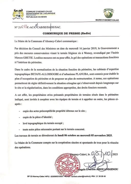 A Womey, dans la commune d’Abomey-Calavi, deux cabinets d’expertise topographique ont été commis pour l’établissement d’un plan d’occupation du périmètre revendiqué par l’héritier Marcos GBETIE. Les cabinets concernés devraient également proposer un plan de restructuration du domaine objet de litige. Le maire Angelo Ahouandjinou, à travers un communiqué en date du 3 octobre 2025, a porté l’information à la connaissance du publique.