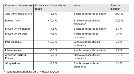 Les volumes de fret aérien ont augmenté en septembre 2025 dans la plupart des grands corridors commerciaux. Les corridors Europe–Asie et intra-asiatique affichent une robuste croissance dans les deux chiffres, tandis que les corridors Moyen-Orient–Asie, Amérique du Nord–Europe et Afrique–Asie ont connu des gains notables. Par contraste, les corridors Asie–Amérique du Nord, Moyen Orient–Europe et intra-européen affichent des déclins.