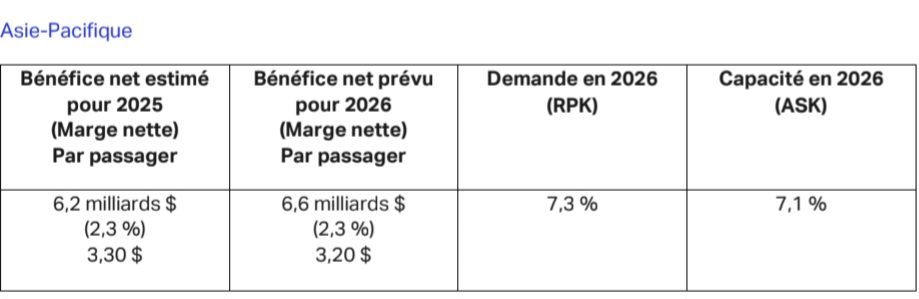 La surcapacité demeure un problème, dans le contexte de la reprise plus lente du trafic international, ce qui met de la pression sur les rendements. Les pressions déflationnistes font aussi fléchir les rendements en Chine. Néanmoins, l’Asie-Pacifique demeure le plus grand contributeur à la croissance du trafic mondial, et les coefficients d’occupation devraient atteindre 84,4 % en 2026, un record pour la région.