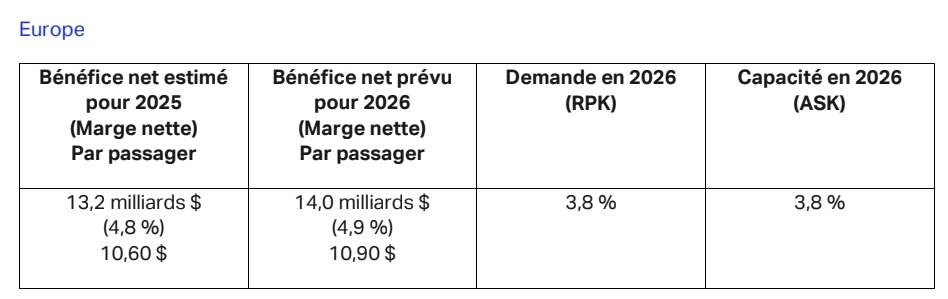 • Les compagnies aériennes devraient réaliser un bénéfice net total combiné de 41 milliards $ (en hausse par rapport aux 39,5 milliards $ de 2025). Tout en établissant un nouveau record, la marge bénéficiaire nette demeurerait inchangée par rapport à 2025, à 3,9 %. Le bénéfice net par passager transporté devrait s’établir à 7,90 $ (moins que les 8,50 $ de 2023, et inchangé par rapport à 2025).
