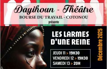 Le 3e spectacle de la 2e saison de Dayihoun-Théâtre aura lieu les jeudi 11, vendredi 12, et samedi 13 décembre 2025, à la Bourse du Travail, Cotonou. La 2e saison de Dayihoun-Théâtre baptisée « Odyssée », continue son voyage théâtral. Le 3e spectacle ‘’Les Larmes d’une Reine’’ est prévu pour les jeudis 11, vendredi 12, et samedi 13 décembre. Marie Bonnemaison, auteure de la réécriture de Les Larmes d’une Reine, et Directrice artistique de la troupe Corélias Productions, présente ce (…)