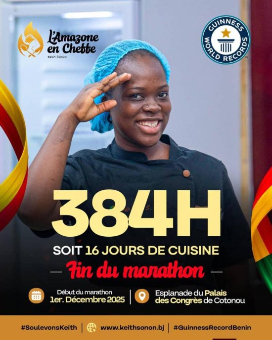 Engagée dans le défi Guinness World Records depuis le 1er décembre, ‘’L’Amazone en cheffe’’ a bouclé 384 heures de cuisine non-stop, soit 16 jours.